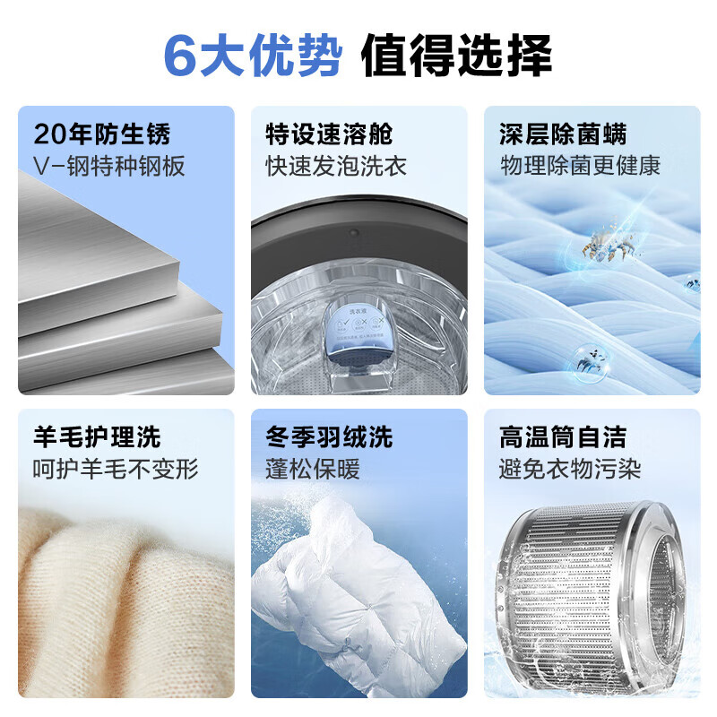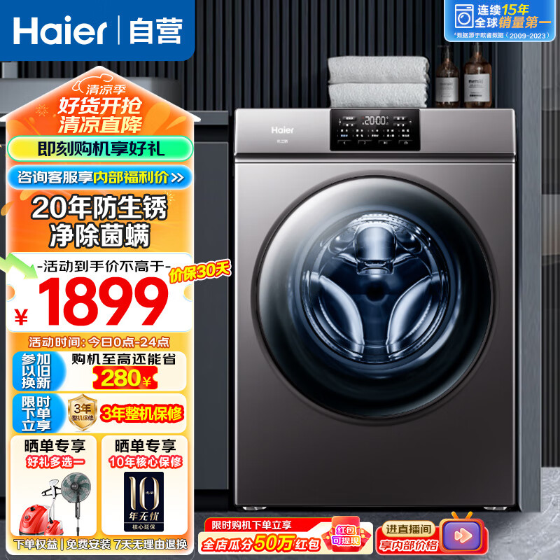 海尔(Haier)10公斤洗衣机全自动滚筒家用变频节能速溶窗除菌螨洗衣机防生锈筒自洁价格:1899.00元!