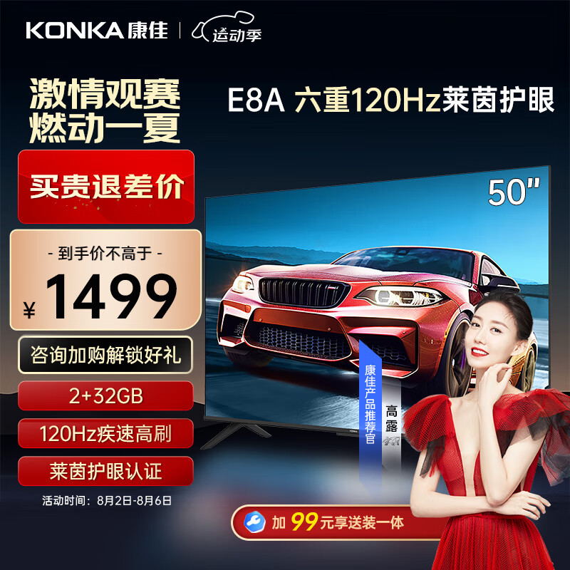 康佳电视 43E8A 43英寸 2+32G 4K超清 金属屏 护眼电视 远场语音 智能投屏液晶平板电视机以旧换新价格:1299.00元!