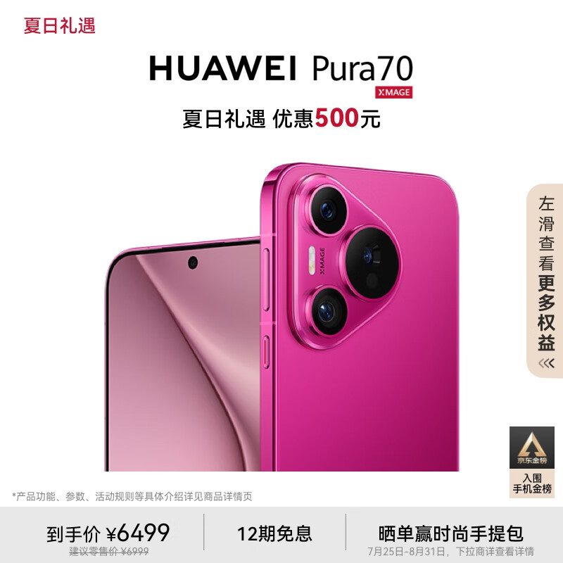 HUAWEI Pura 70 樱玫红 12GB+1TB 超高速风驰闪拍 第二代昆仑玻璃 双超级快充 华为P70智能手机价格:6499.00元!