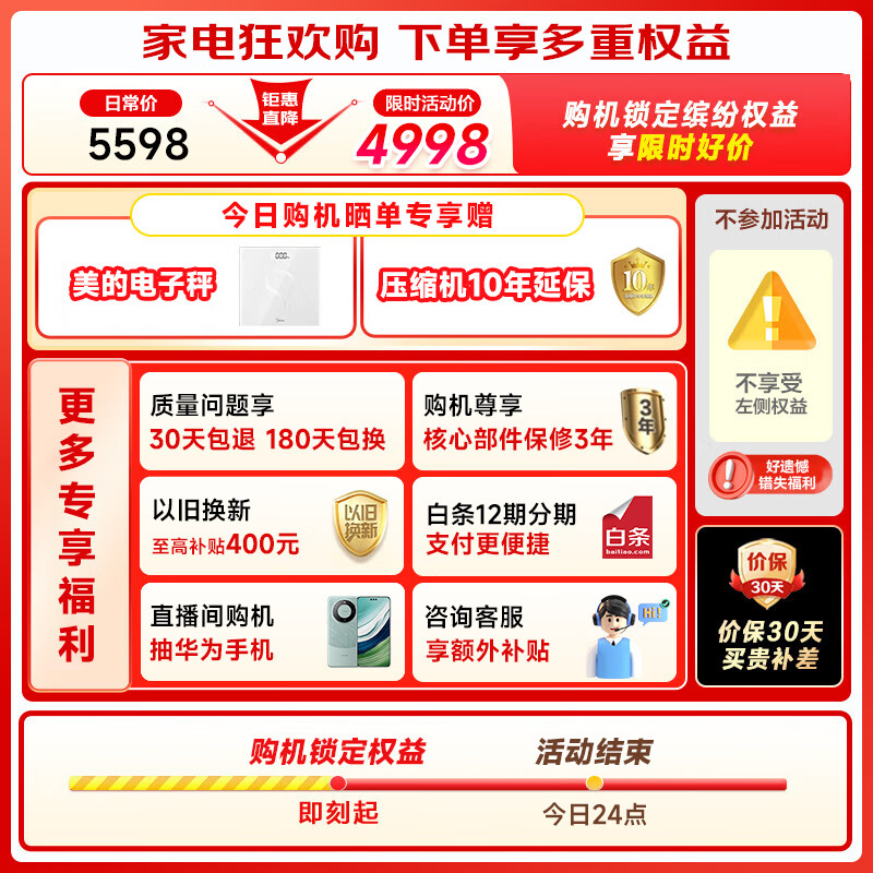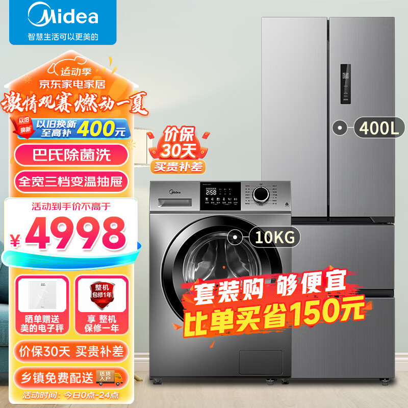 美的(Midea)417法式多门四开门冰箱 M60超薄冰箱+10公斤滚筒全自动洗衣机 MR-417WFPE+MG100VC133WY价格:4998.00元!