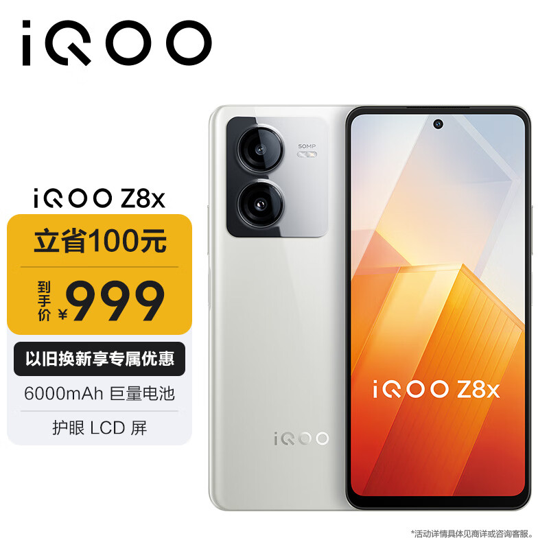 vivo iQOO Z8x 8GB+128GB 月瓷白 6000mAh巨量电池 骁龙6Gen1 护眼LCD屏 大内存5G电竞手机价格:1099.00元!