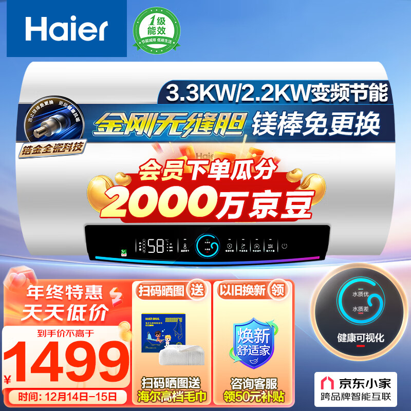 海尔(Haier)60升电热水器3300W变频镁棒免更换健康可视金刚无缝胆WIFI控EC6002-PD5(U1)价格:1599.00元!
