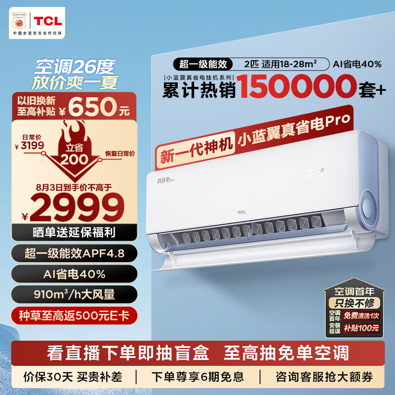 TCL空调 2匹小蓝翼真省电Pro 空调挂机 超一级能效省电40% 变频冷暖 卧室挂机KFR-46GW/RT2Ea+B1价格:2999.00元!