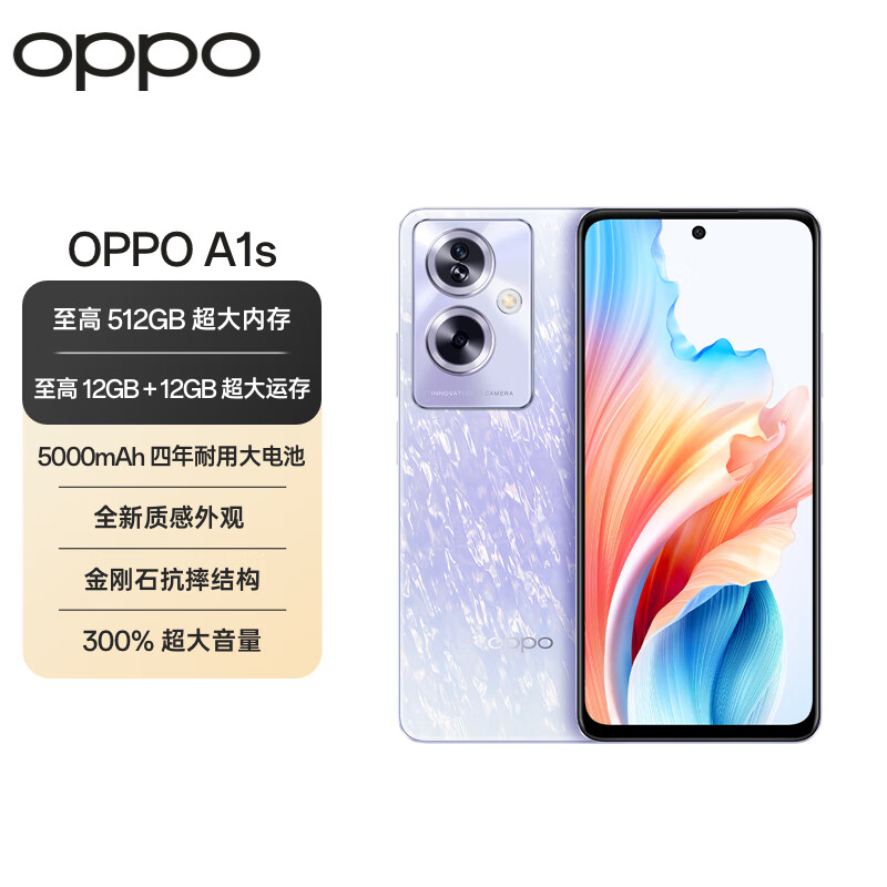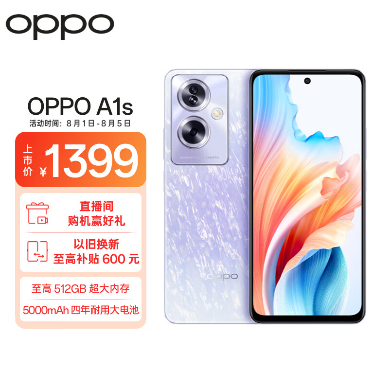 OPPO A1s 12GB+512GB 暮山紫 超大内存 超大运存 5000mAh四年耐用大电池 闪充 5G 长续航抗摔 智能手机价格:1399.00元!