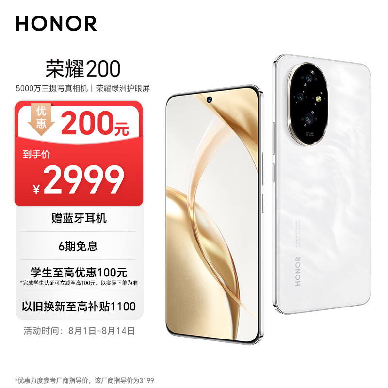 荣耀200 旗舰级青海湖电池 绿洲护眼屏 5000万雅顾光影主摄 第三代骁龙7 AI 16+512 月影白 5G价格:2999.00元!