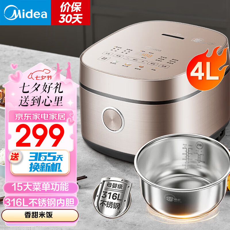 美的(Midea) 电饭煲电饭锅家用2-3-4-5-8人大容量智能不粘锅多功能圆灶釜可选0涂层青瓷陶瓷内胆款 0涂层不易粘锅款(3-8人) 4L价格:499.00元!