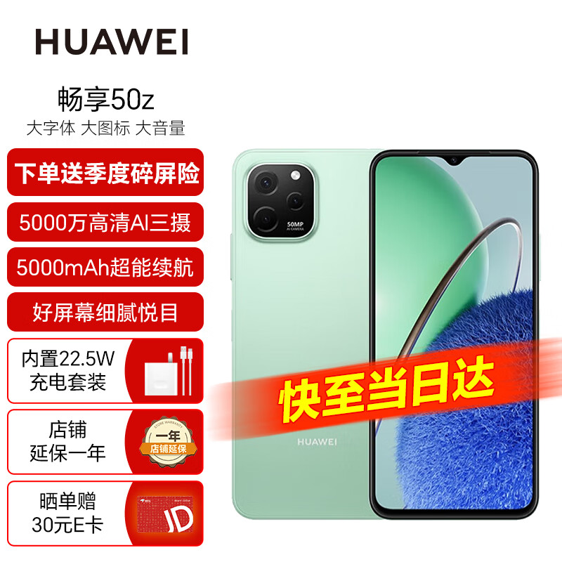 华为畅享 50z 手机 5000Ah大电池 5000万高清三摄 8+128GB 薄荷绿 大内存鸿蒙智能手机价格:1349.00元!
