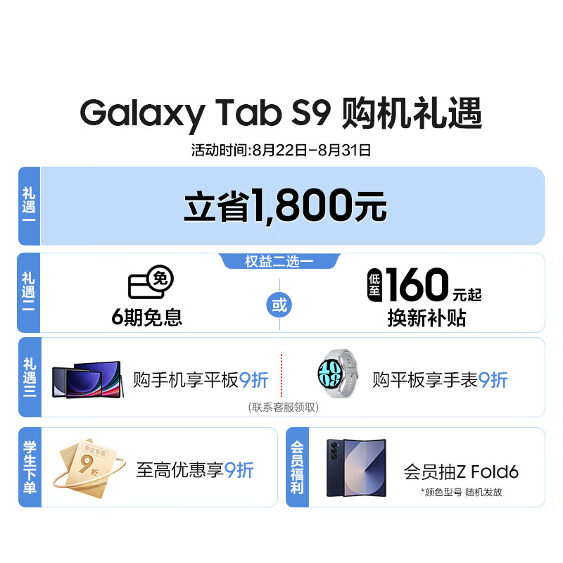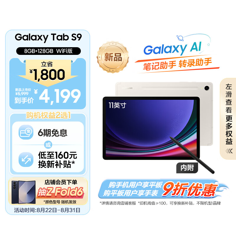 三星(SAMSUNG)S9 Al智享学习办公平板电脑11英寸骁龙8Gen2 120Hz 8G+128GB WIFI版含Spen AI平板云雾金价格:4199.00元!