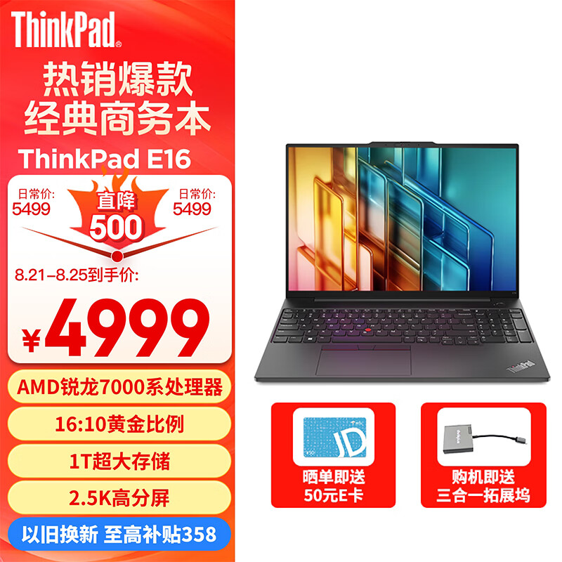 ThinkPad E16 16英寸轻薄大屏联想笔记本电脑 R7-7730U 16G 1T 2.5K 100%sRGB 黑 商务大屏 AI生态价格:4999.00元!