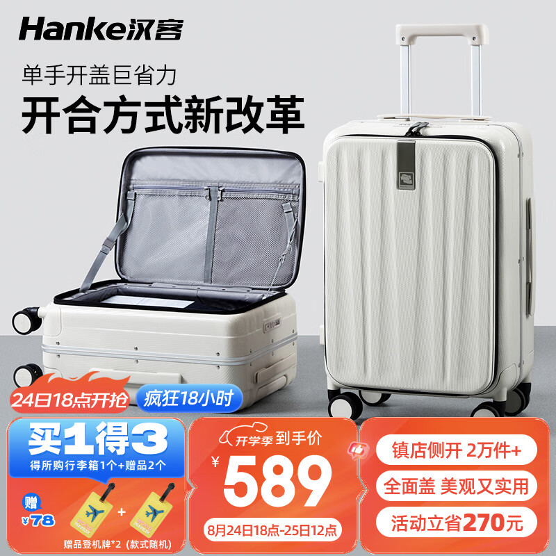汉客行李箱男拉杆箱女旅行箱88升大容量26英寸象牙白镇店前侧开盖铝框价格:859.00元!
