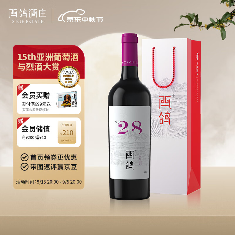 西鸽酒庄N28马尔贝克国产干红葡萄酒750ml*1 宁夏贺兰山红酒中秋礼盒送礼价格:298.00元!