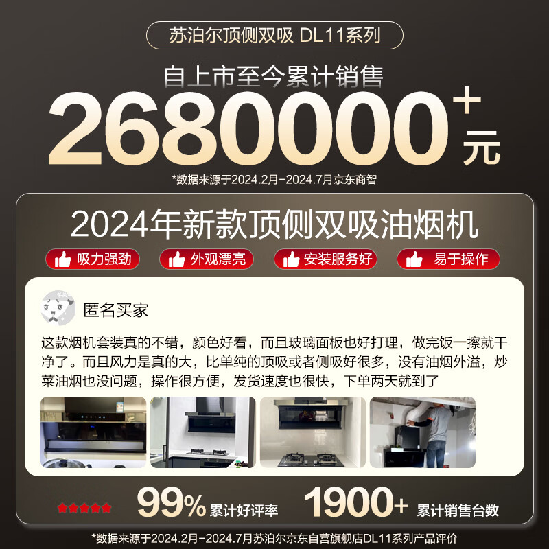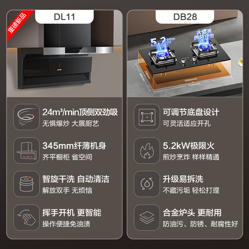 苏泊尔(SUPOR)抽油烟机 顶侧双吸7字型烟灶套装24立方挥手免拆洗家用烟机燃气灶具套装DL11+DB28天价格:1997.00元!
