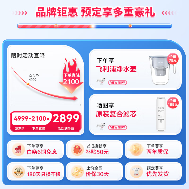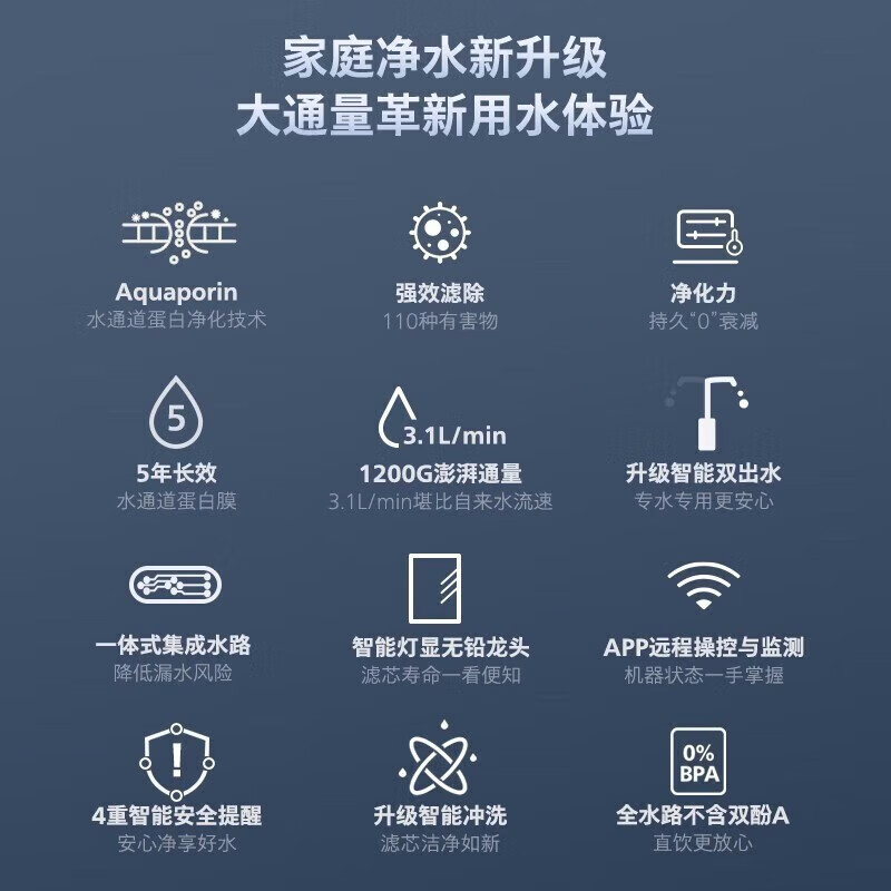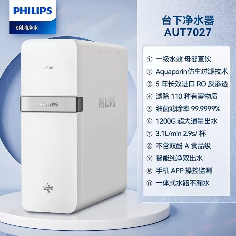 飞利浦(PHILIPS)净水器家用净水机 1200G5年RO反渗透 母婴直饮3.1L/min流速双出水净水器AUT7027价格:2899.00元!