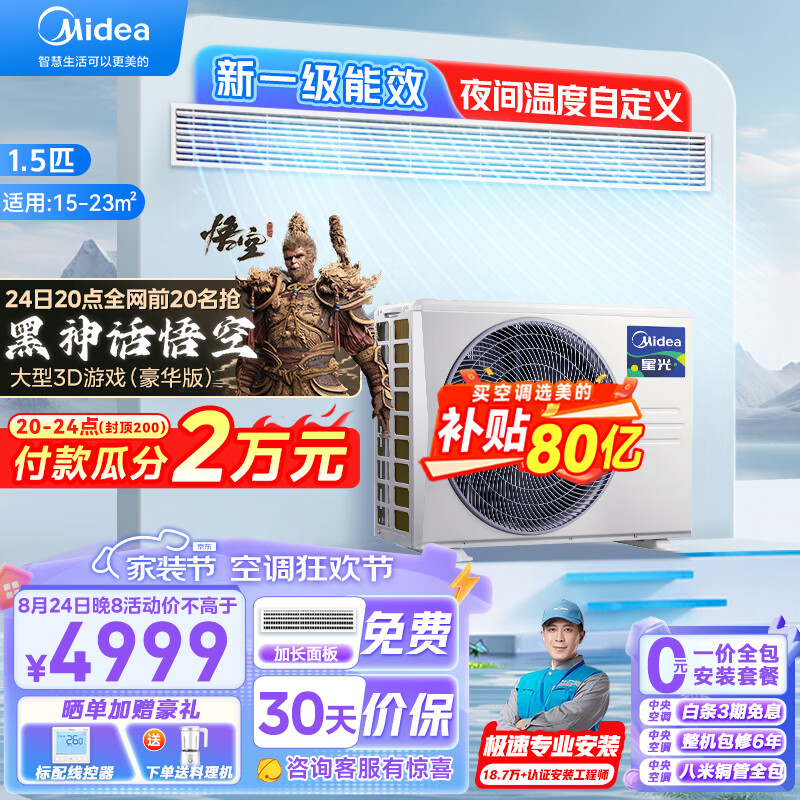 美的(Midea)中央空调风管机一拖一1.5匹一级能效变频冷暖家用嵌入式卧室星光时尚版KFR-35T2W/BN8-XG(1)Ⅲ价格:4998.00元!