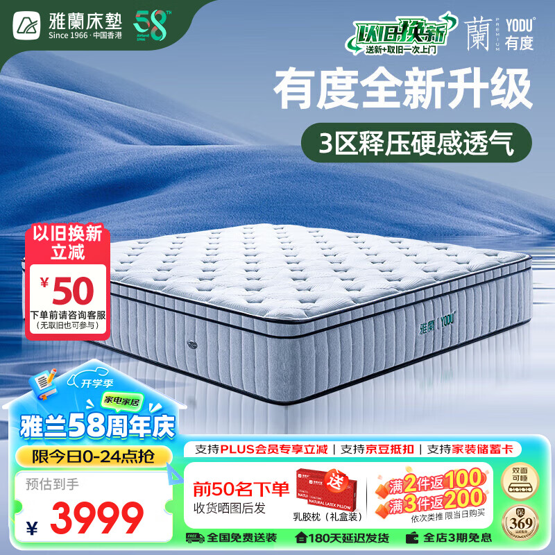 雅兰(AIRLAND)三区硬睡感恒温床垫透气垫层弹簧床垫有度Pro+ 1.5*1.9米价格:5999.00元!