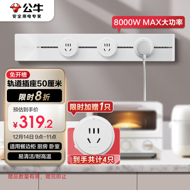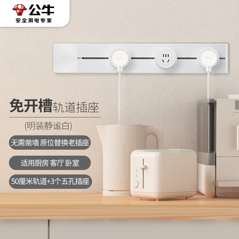 公牛(BULL)明装 轨道插座 可移动墙壁插座壁挂式/插线板/接线板 多功能免打孔 50厘米轨道+3个五孔插座白色价格:399.00元!