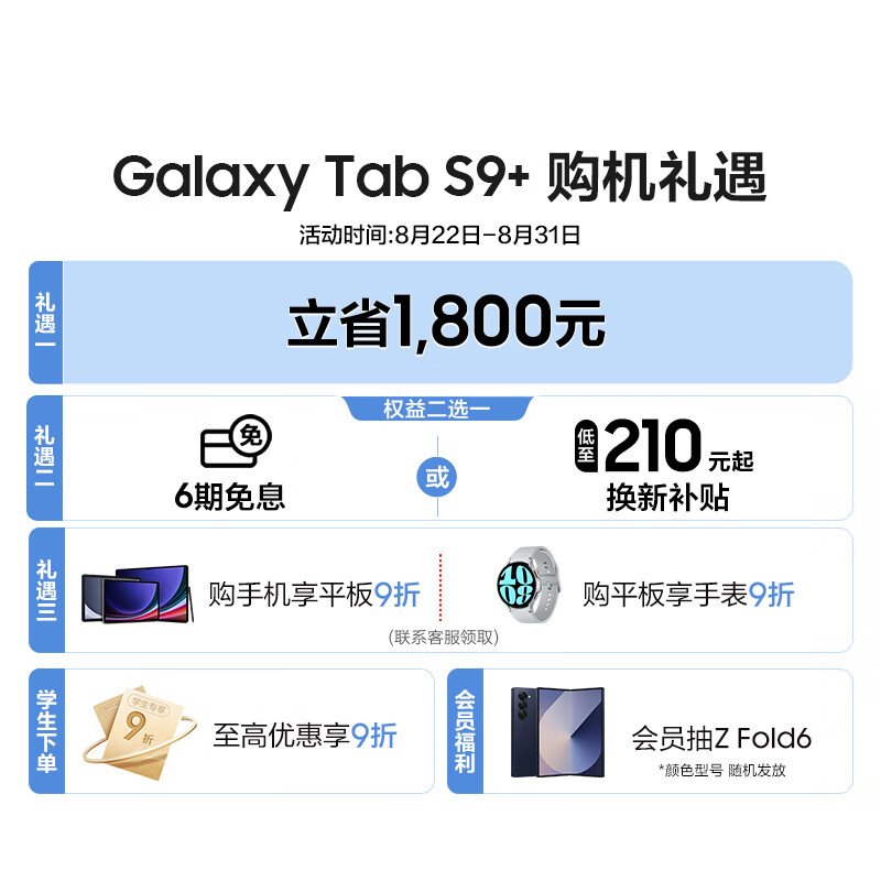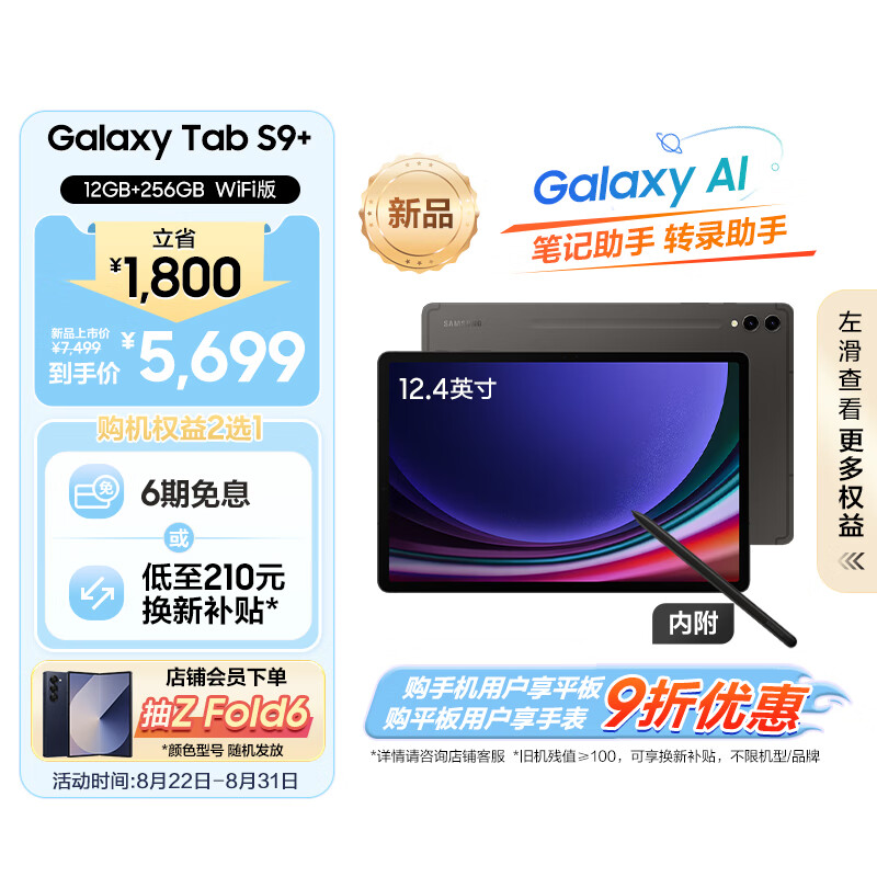 三星(SAMSUNG)S9+ Al智享学习办公平板电脑12.4英寸骁龙8Gen2 120Hz 12G+256GB WIFI版 AI平板 云影灰价格:5699.00元!
