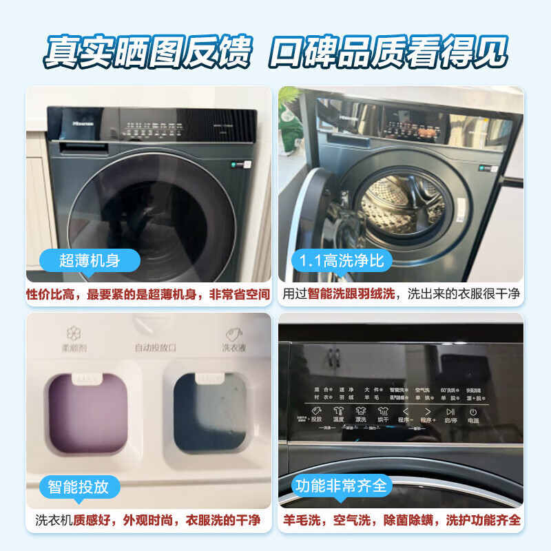 5、洗衣机大促价格太划算了,保修也长,以旧换新还有补贴,包安装,超薄的出来很小。面板简洁明了,一般情况就自动模式就好,比波轮洗衣机省水,下水也不急,开始还担心老房子下水反水呢。
