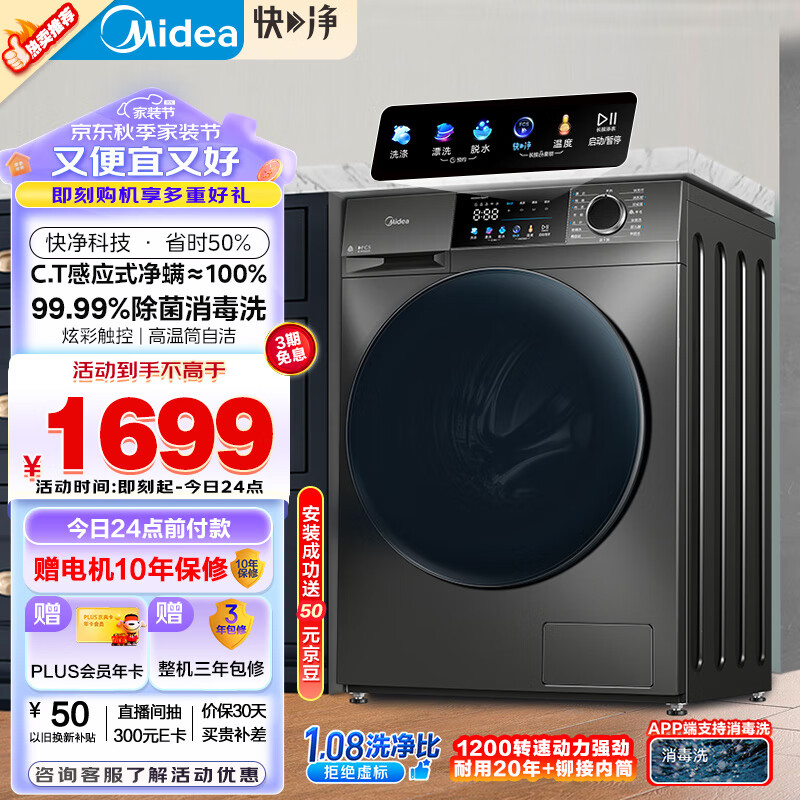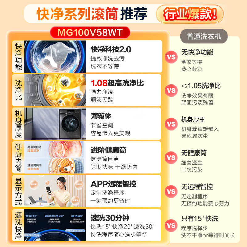 美的(Midea)滚筒洗衣机全自动家用 MG100V58WT 超薄洗衣机10公斤 快净系列 净螨除菌 智能远程操控 1.08洗净比价格:1669.00元!