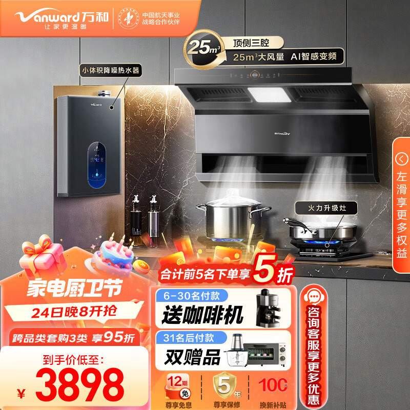 万和(Vanward)烟灶热全家桶 三腔7字型大吸力1000Pa变频油烟机燃气灶具热水器 WL860+C5L90S+ME5D16(天然气)价格:3898.00元!