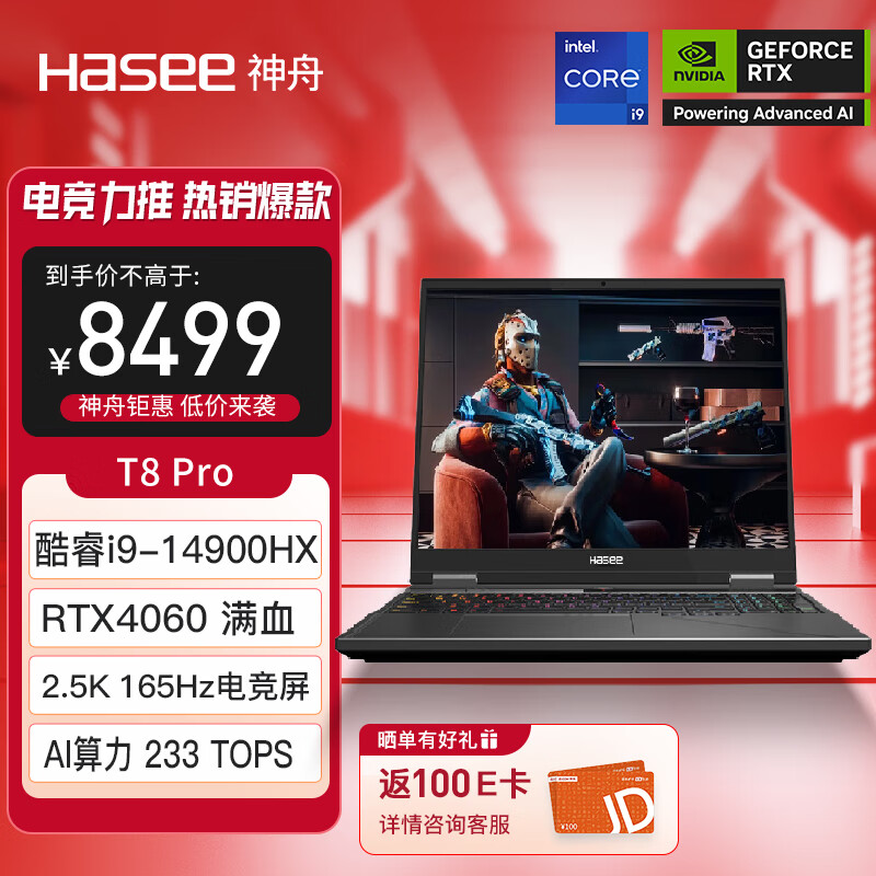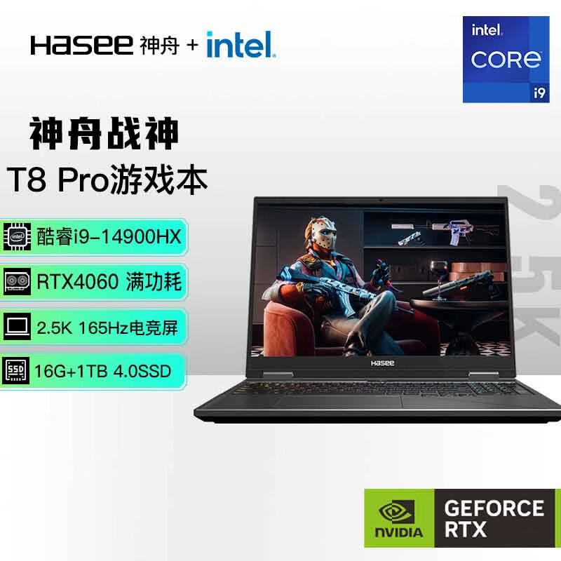 神舟(HASEE)战神T8 Pro 14代英特尔酷睿i9 16英寸游戏本 笔记本电脑(I9-14900HX RTX4060 165Hz 2.5K电竞屏)价格:8499.00元!