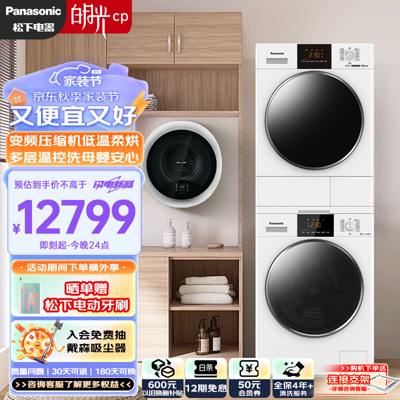 松下(Panasonic)【白月光+小旋风】CP洗烘套装 10kg滚筒洗衣机+热泵烘干机+壁挂洗衣机810F+F1ER2+AD500W价格:12799.00元!