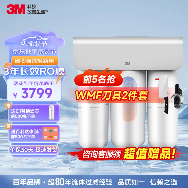 3M净水器家用净水机直饮RO反渗透厨下过滤器700G大通量1.84L/min家用纯水机HFRO-S725价格:4359.00元!