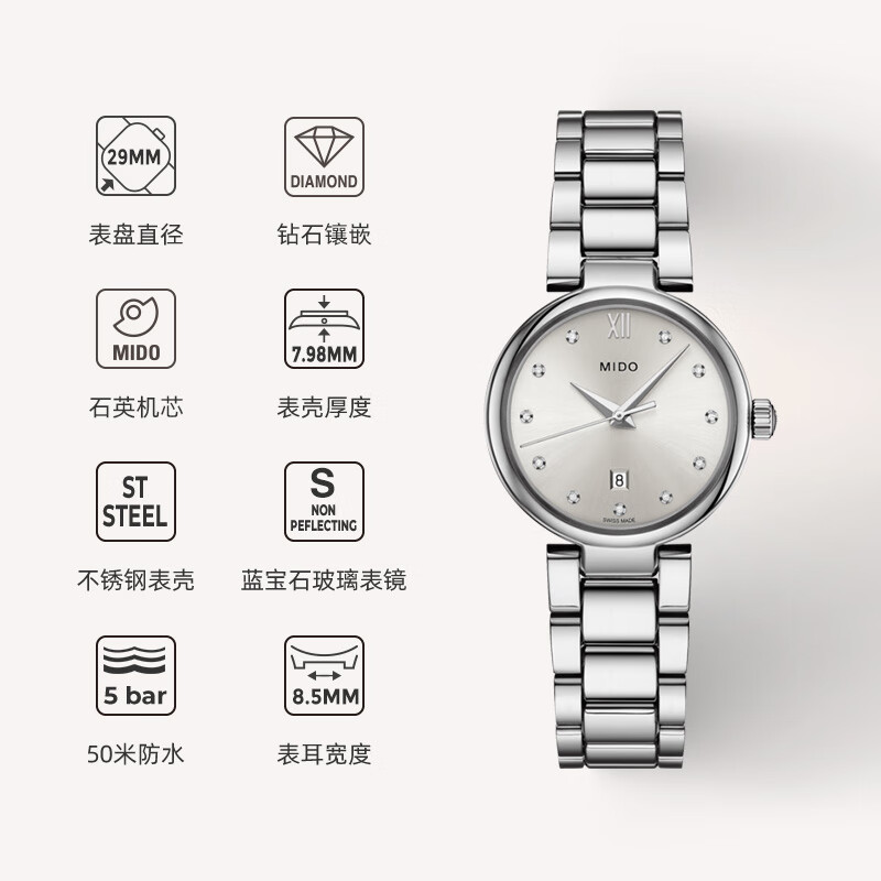 美度(MIDO)瑞士手表 贝伦赛丽系列 多娜 真钻 时尚优雅 石英钢带女表价格:3772.00元!