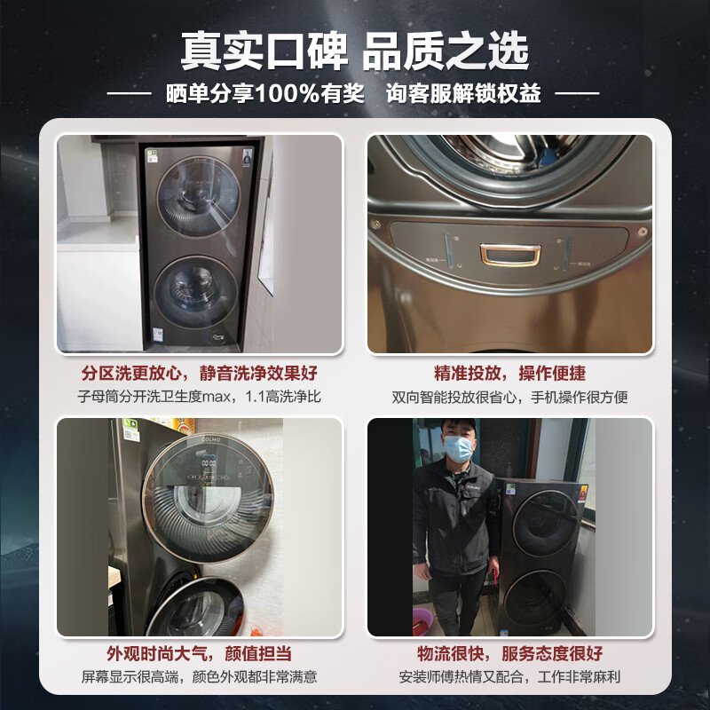此款COLMOCLGG13E外观我比较的喜欢,质量特别的好,洗衣机外观很好看,看着高大上,上下桶可以同时洗干净又卫生!洗衣机很重,洗净效果非常好!