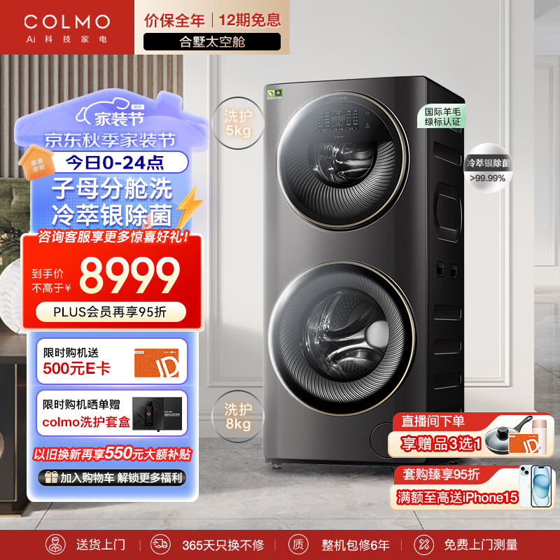COLMO 子母舱母婴分区洗衣机 滚筒全自动 13KG大容量 变频电机 智能投放 冷萃银除菌 合墅太空舱CLGG13E价格:8999.00元!