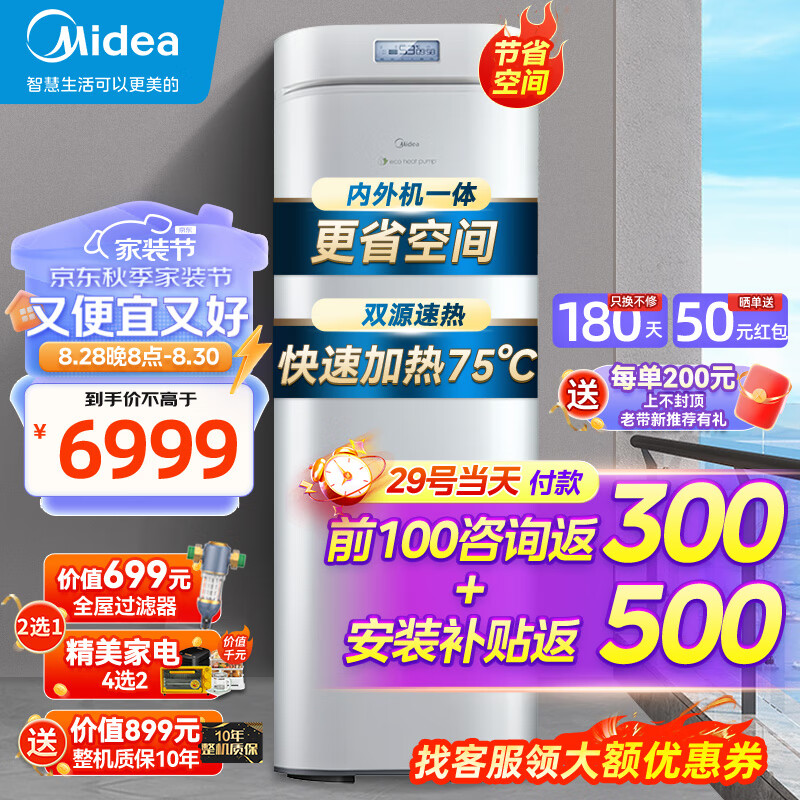 美的( Midea) 空气能热水器一体机WIFI智控双源速热75°高温180升包安装家用 RSJ-18/180RDN3-E2价格:6999.00元!