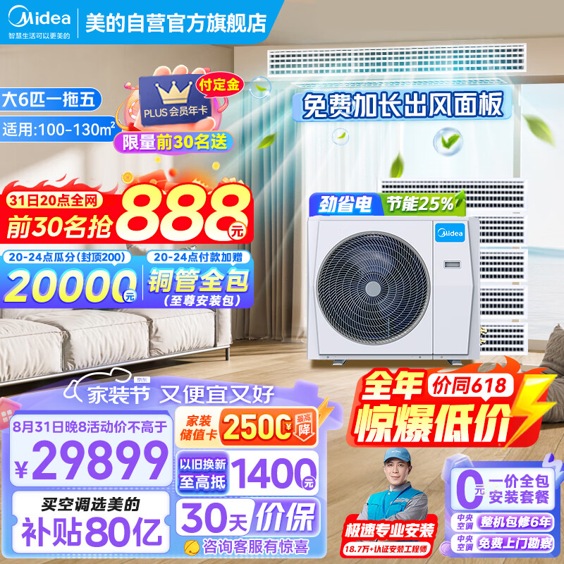 美的(Midea)中央空调一拖五多联机大6匹星光全直流变频新一级能效智能除菌自清洁MDS-160W-X6-(1)Ⅲ价格:29898.00元!