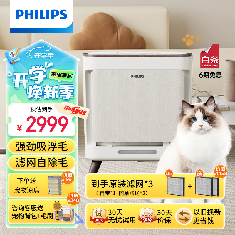 飞利浦(PHILIPS)宠物空气净化器 除甲醛吸猫毛净化器 除臭除异味除过敏原 吸附浮毛四脚兽AC3680价格:2999.00元!