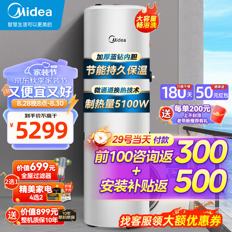 美的(Midea)空气能热水器家用300升蓝钻内胆水电分离智能WiFi省电包安装发廊适用热水王KF109/R-X2-300-(E3)价格:6799.00元!