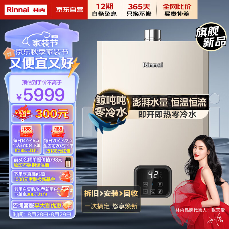 林内(Rinnai)【鲸吨吨零冷水】20升大水量燃气热水器 即开即热即恒温热水器20GD61R(JSQ40-GD61R)以旧换新价格:5999.00元!