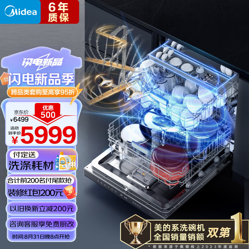 美的(Midea)16套嵌入式洗碗机 GX1000Pro 升级105℃热风烘干 五臂飓风洗 双驱变频 四星消毒 一级水效 独立式价格:5999.00元!